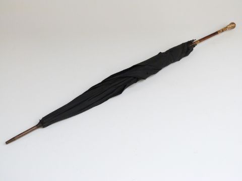 A late 19thC/20thC parasol with 18ct gold plated handle and two collars, tiger's eye style insert and hardwood stick, 90cm