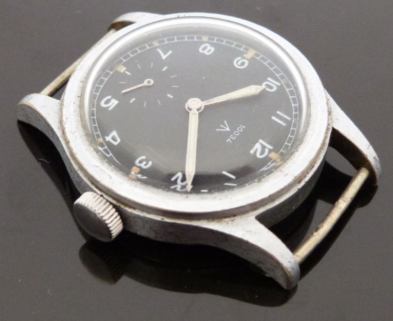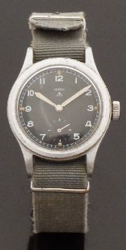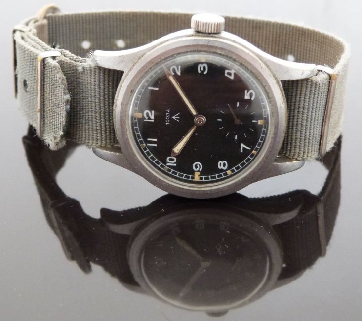 Record gentleman's military wristwatch with subsidiary seconds dial, luminous steel hands, white Arabic numerals, railroad minute track, ministry arrow and 10034 to the black face, plated case marked to the back 'WWW L31533 549380' around ministry broad arrow and signed 15 jewel calibre 022K movement, on grey canvas NATO style strap, case diameter 36mm.