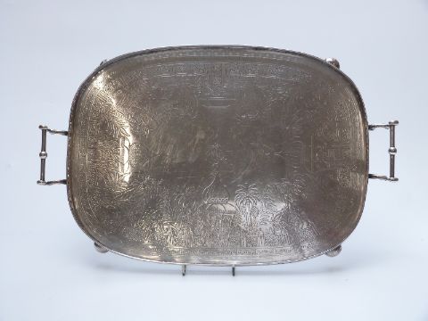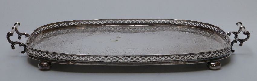 Maple and Co London twin handled silver plated tray raised on ball feet, length 49cm