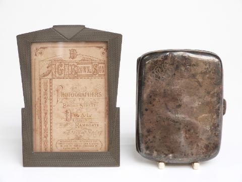 Hallmarked silver cigarette case, weight 73g and an Art Deco pewter photo frame, height 11cm