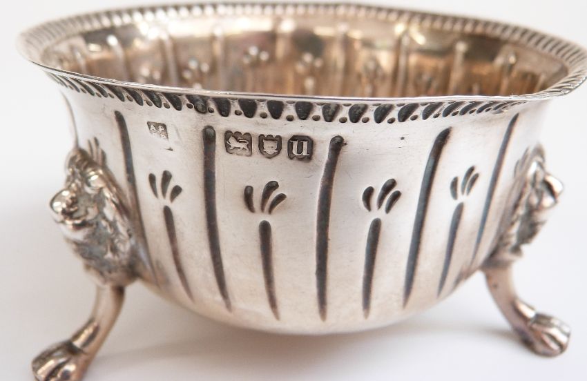 George V hallmarked silver sugar bowl with embossed decoration raised on three lion's mask and paw feet, London 1915 maker Pairpoint Brothers, diameter 10cm, weight 128g
