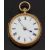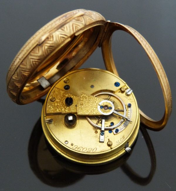 18ct gold open faced pocket watch with blued hands, Roman numerals, white enamel face, engraved case and engraved movement, case diameter 38.5mm, serial number 96020, 51g.