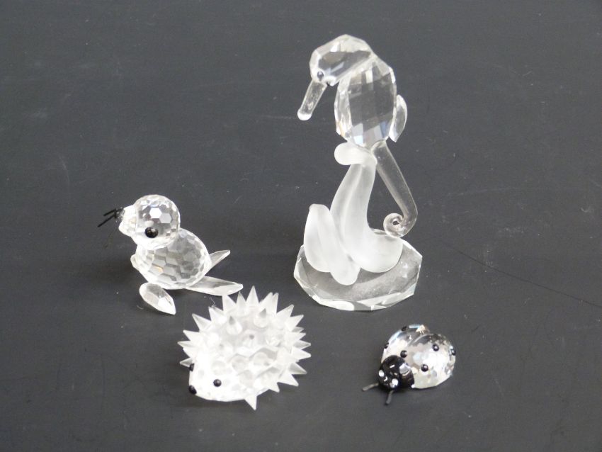 Four Sworovski Crystal cut glass figure groups comprising Seahorse, Ladybird, Seal Pup and Hedgehog, in original boxes