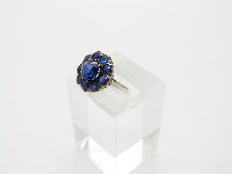 A white metal ring set with a cluster of natural and synthetic sapphires, size G, 3.1g
