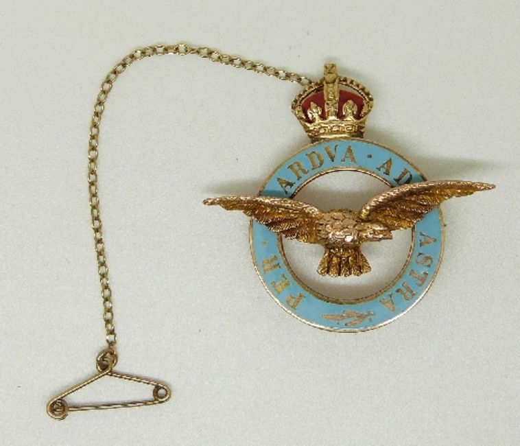 A 9ct gold RAF brooch reading 'per ardua ad astra' (through adversity to the stars) with blue enamel and textured eagle, 3.5 x 3.2cm