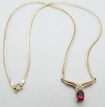 A 9ct gold necklace set with an oval synthetic ruby and diamonds, 5.5g
