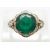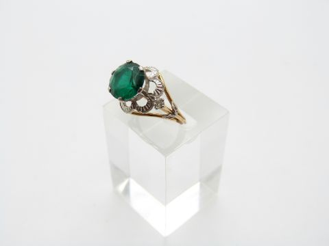 A yellow metal ring set with a synthetic emerald and two diamonds, size K