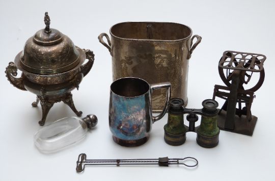 Sliver plate to include food warmer, wine cooler, hip flask, opera glasses etc