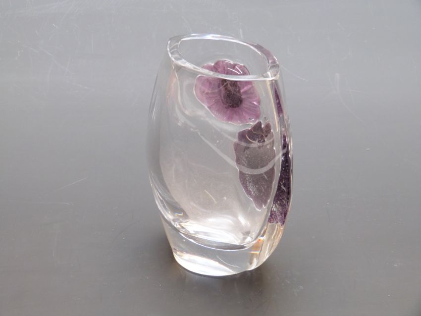 Daum Coppelia clear glass vase with applied pink and purple pate de verre flowers, 19cm tall.