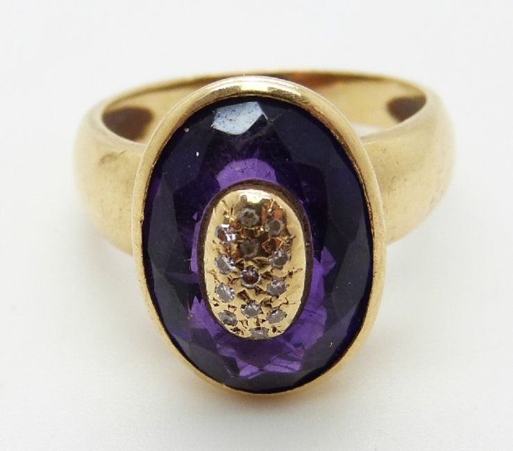An 18ct gold ring set with a faceted oval amethyst with a central diamond set section, size V