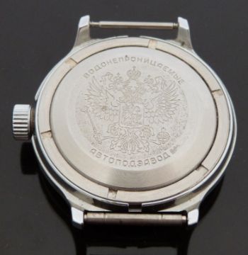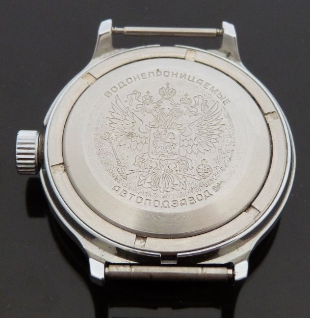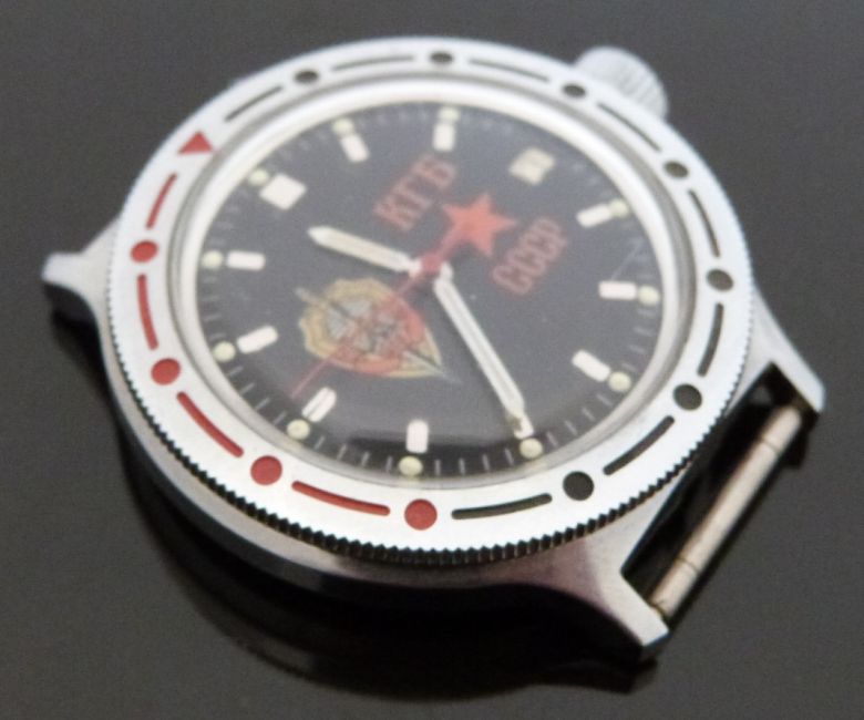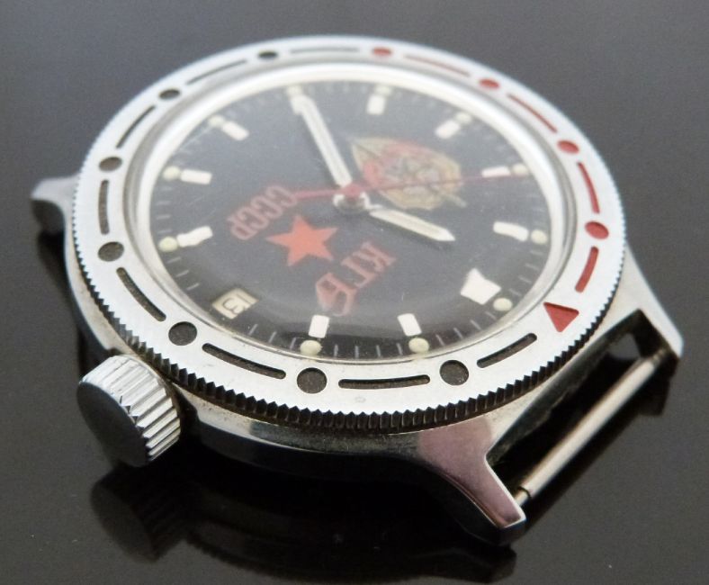 Soviet Russian KGB CCCP gentleman's military or diver's style automatic wristwatch with date aperture, luminous hands and dot markers, KGB crest to black face, black and red inset steel bezel, stainless steel case marked with Russian script and crest and calibre 2416 movement, case diameter 40mm.