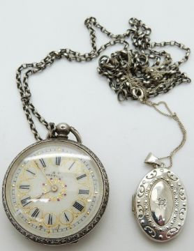 A silver fob watch, silver chain, silver locket set with a diamond and another silver chain