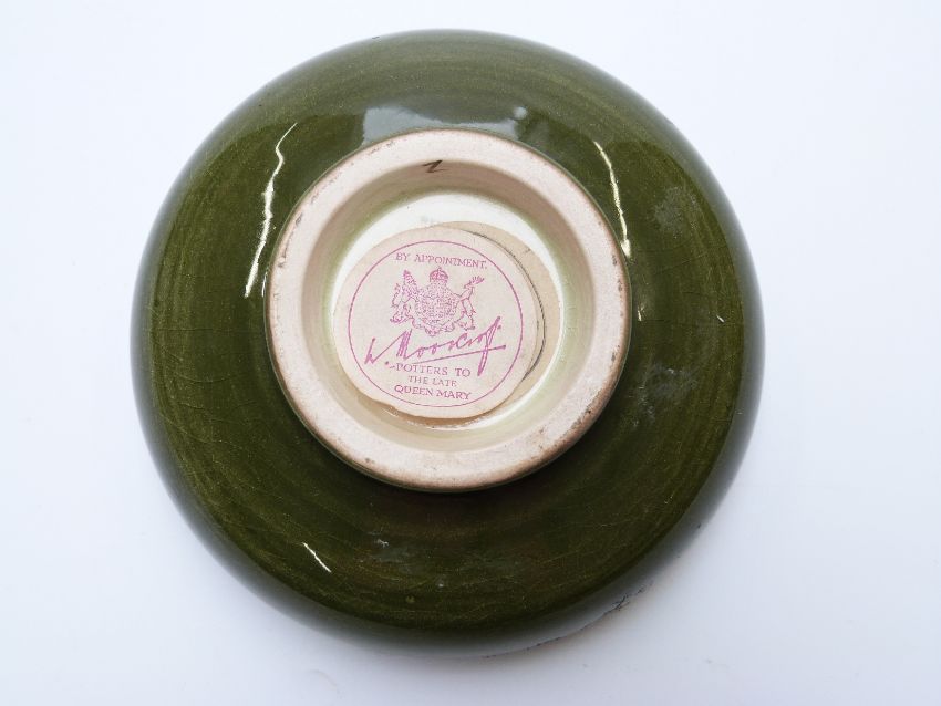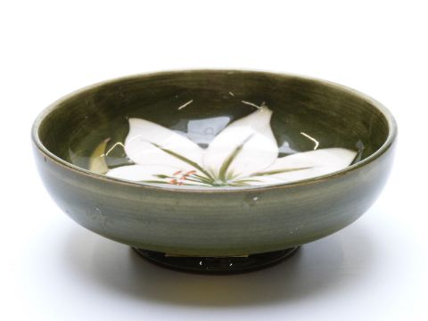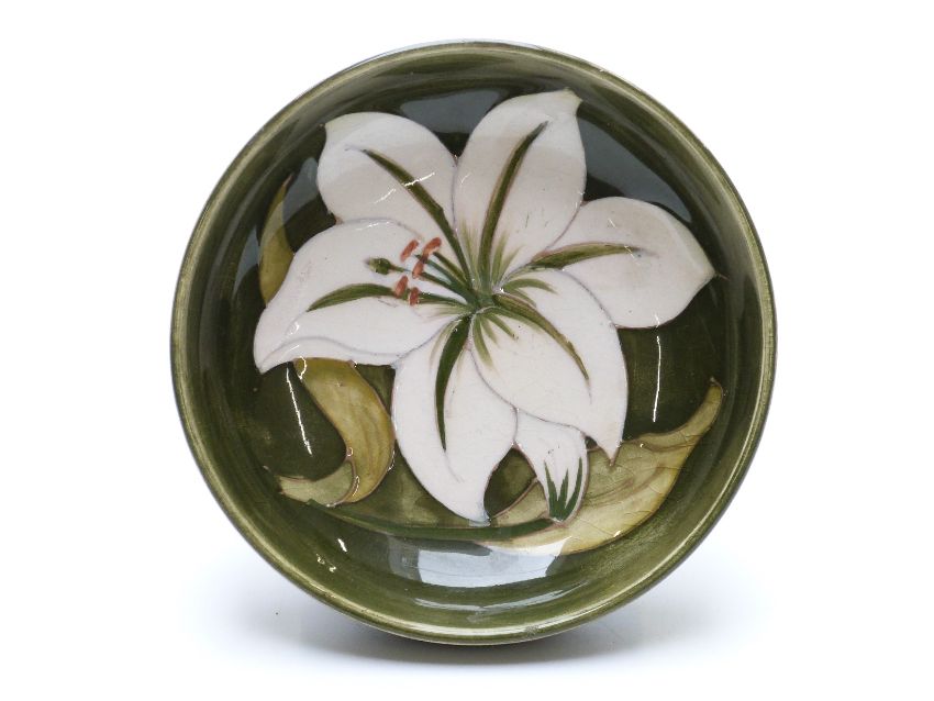 Moorcroft pedestal dish decorated with lilies on a green ground, diameter 11.5cm