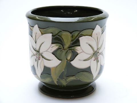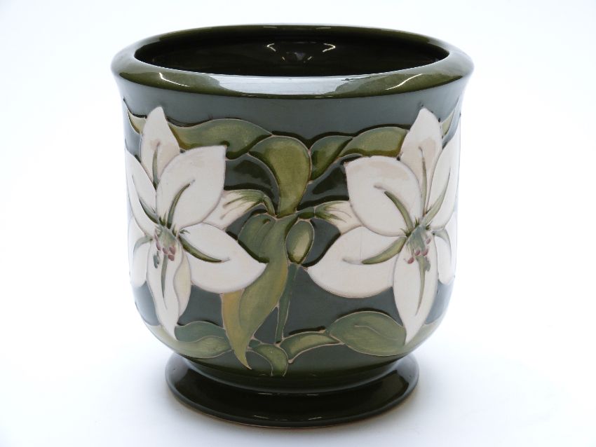 Moorcroft jardiniere decorated with lilies on a green ground, signed to base, 17 cm tall