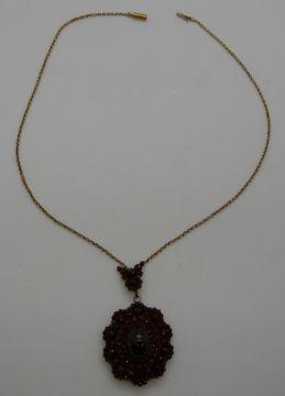 A Victorian pendant set with tiered Bohemian garnets on a yellow metal chain, 12.25g