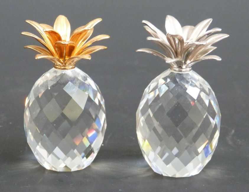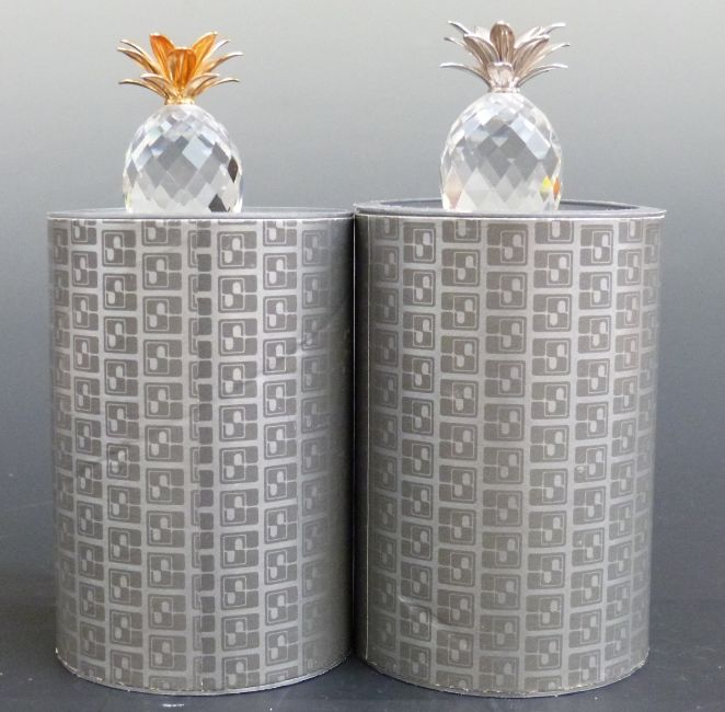 Two Swarovski Crystal cut glass gold and silver plated mounted Pineapples, each 6cm tall, in original boxes