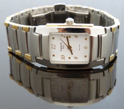 Tissot T-10 ladies wristwatch ref. T073310A with gold hands and dot markers, Arabic numerals, white face, stainless steel case and quartz movement, on bi-metal bracelet, case diameter 25.5mm, serial number 12BC0446182.