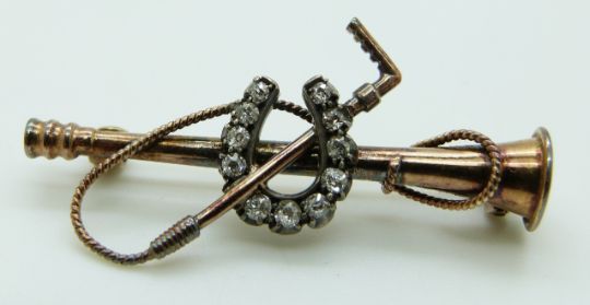 A late Victorian brooch in the form of a horn, whip and a horseshoe set with diamonds
