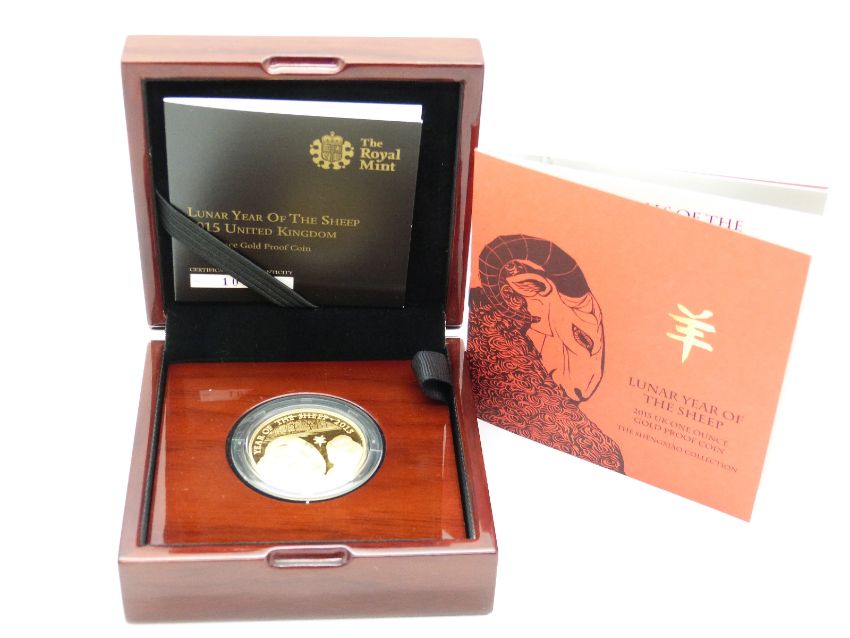 Royal Mint Lunar Year of the Sheep 2015 UK one pound gold proof coin, cased with certificate no. 109