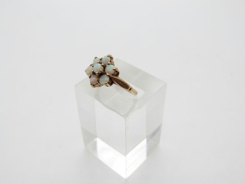 A 9ct gold ring set with a cluster of opal cabochons, size K