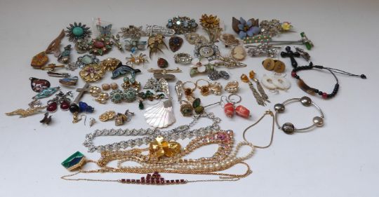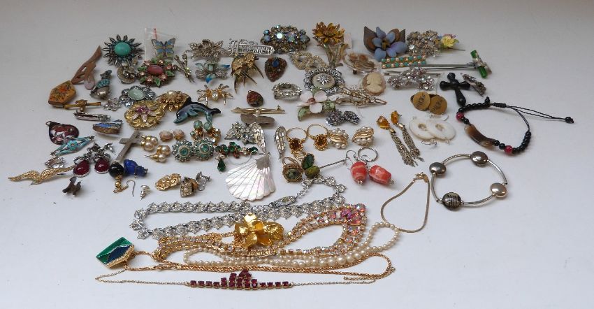A collection of costume jewellery brooches including 1930s enamel example, lucite and paste set brooches