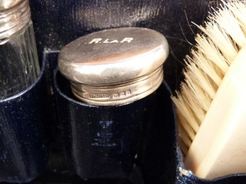 Leather cased hallmarked silver and ivory mounted travelling set comprising five hallmarked silver lidded bottles, three ivory backed brushes, mirror etc, silver items all London 1934, maker's mark J P & Co Ltd, width of case 60cm