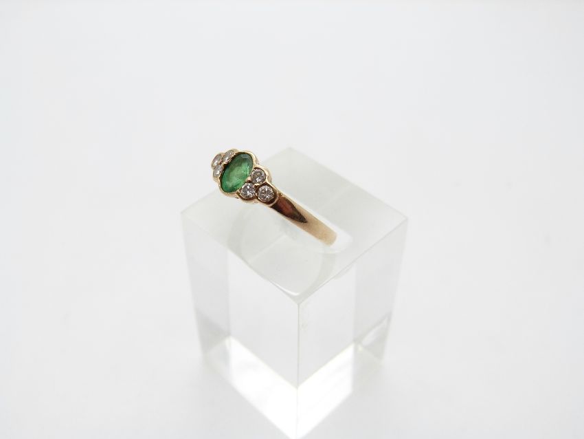 A 9ct gold ring set with an oval emerald and six diamonds, size N/O