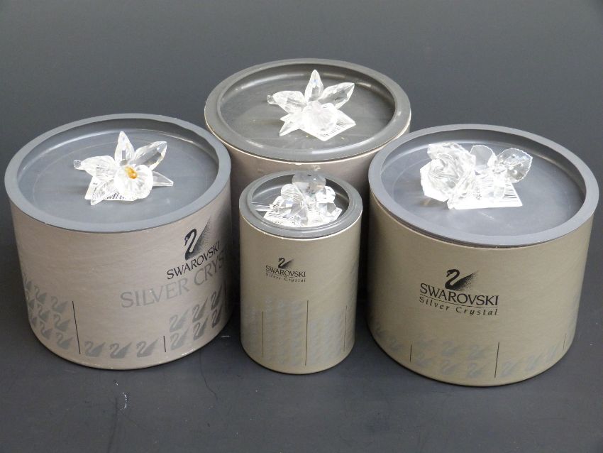 Four Swarovski Crystal cut glass flower paperweights, largest 8cm long, in original boxes