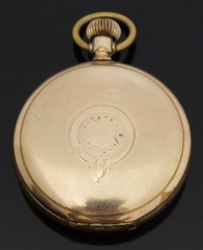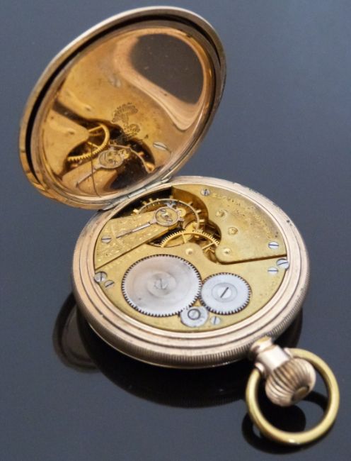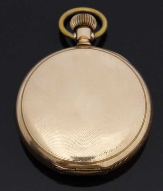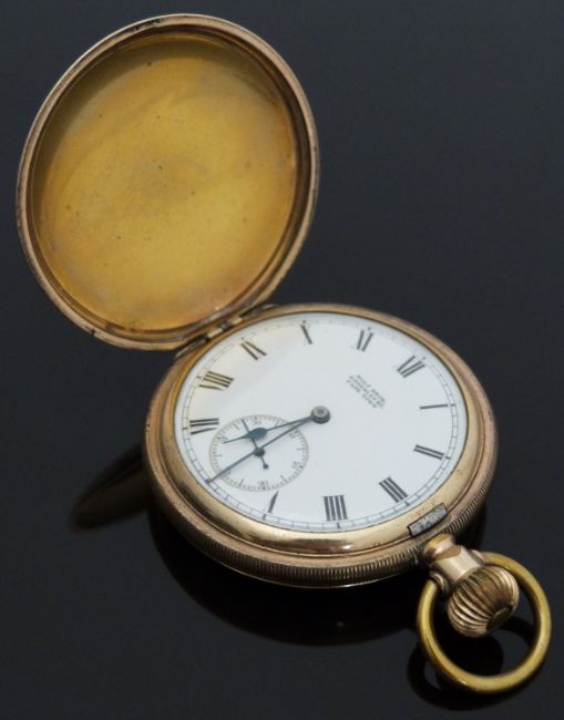 Elgin Watch Co for Wolf Brothers of Adderley Street Cape Town gold plated full hunter keyless winding pocket watch with Roman numerals, inset subsidiary seconds dial, blued hands, engine turned case and signed 17 jewel movement, case diameter 51mm, serial number 16873219.