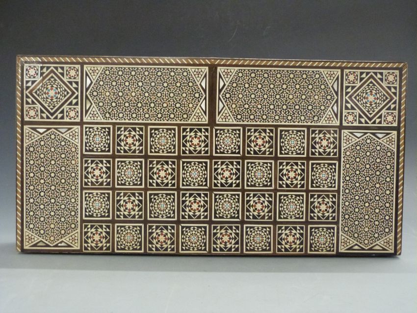 Eastern inlaid games compendium with smaller box housing games and a chess set in box, width 50.5cm