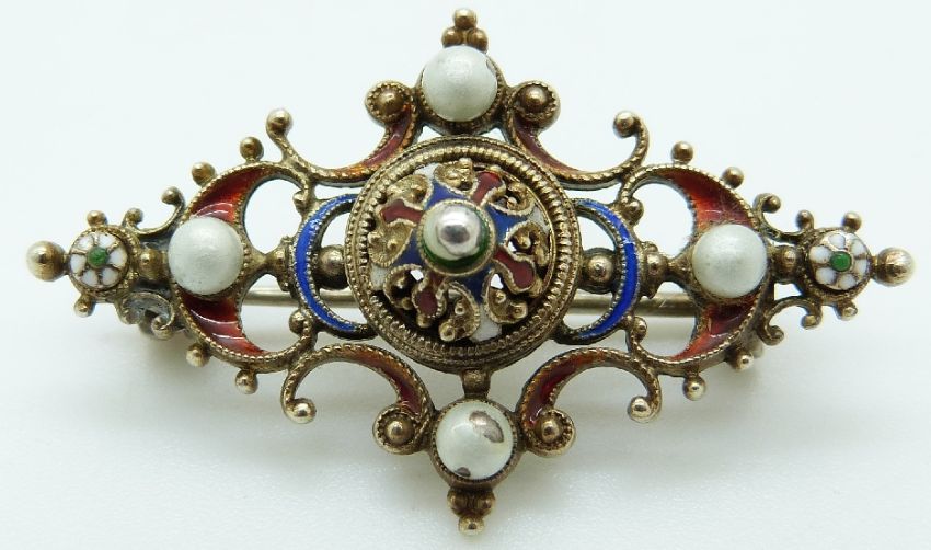 Silver gilt Austro Hungarian brooch set with enamel, maker HC, L3.7cm, W2.3cm