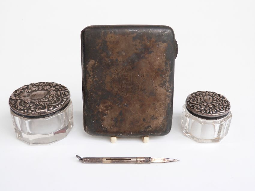 Hallmarked silver card case 103g, two silver topped dressing table pots and a propelling tooth pick marked sterling silver