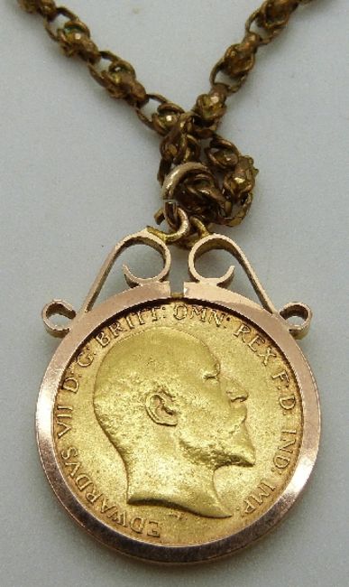 A 1909 gold half sovereign in 9ct gold clip mount, 5.6g