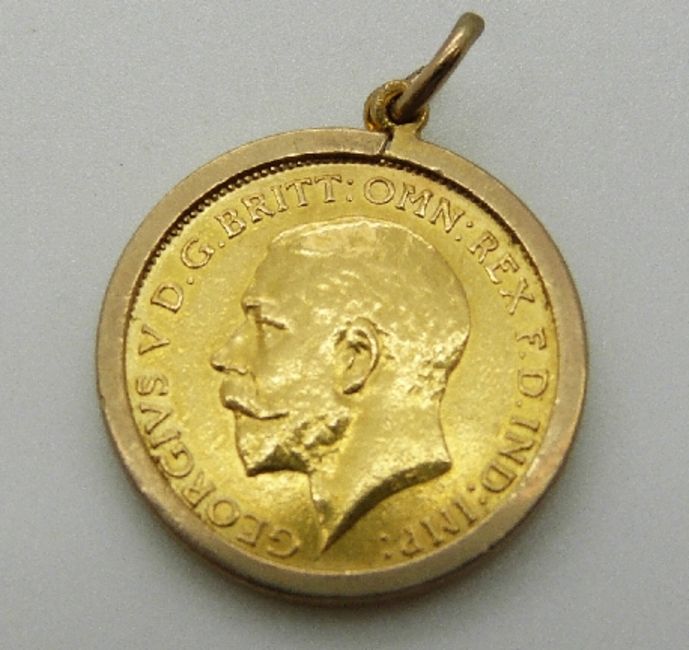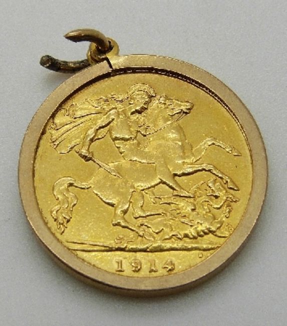 A 1914 gold half sovereign in 9ct gold clip mount, 4.9g