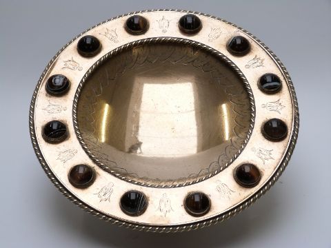 A 19thC gilt metal tazza set with twelve banded agate cabochons, diameter 32cm