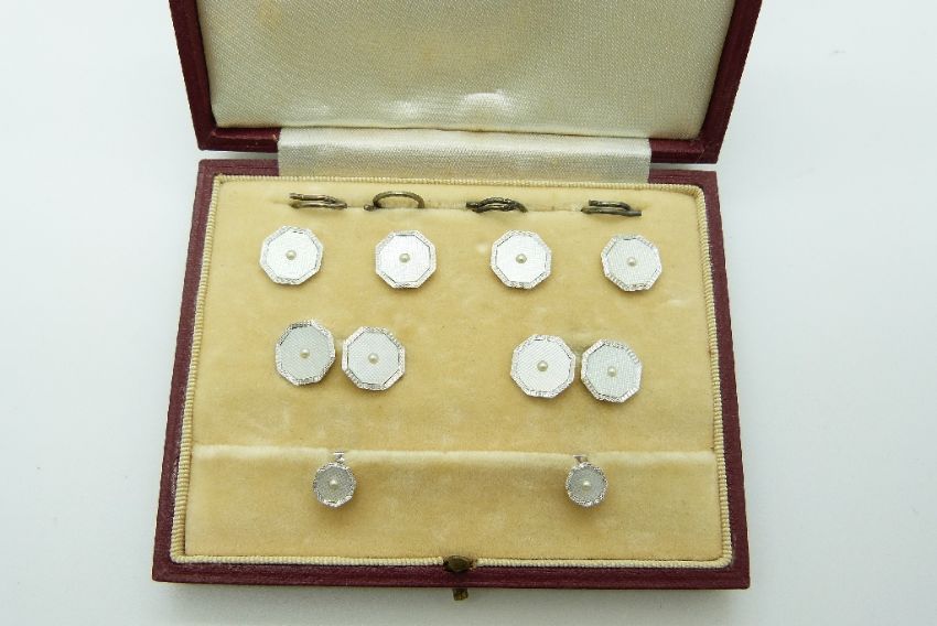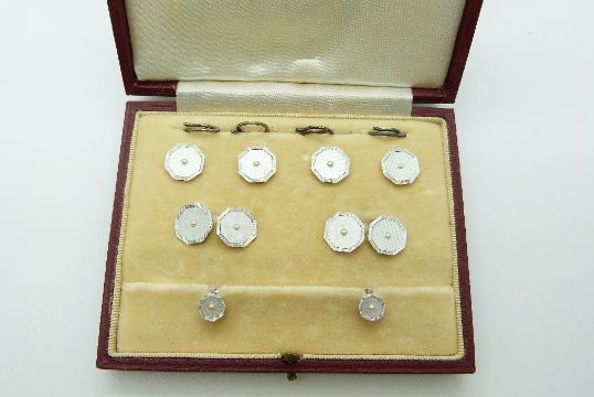 A set of 9ct white gold studs and cufflinks in Harrods box, 10.69g
