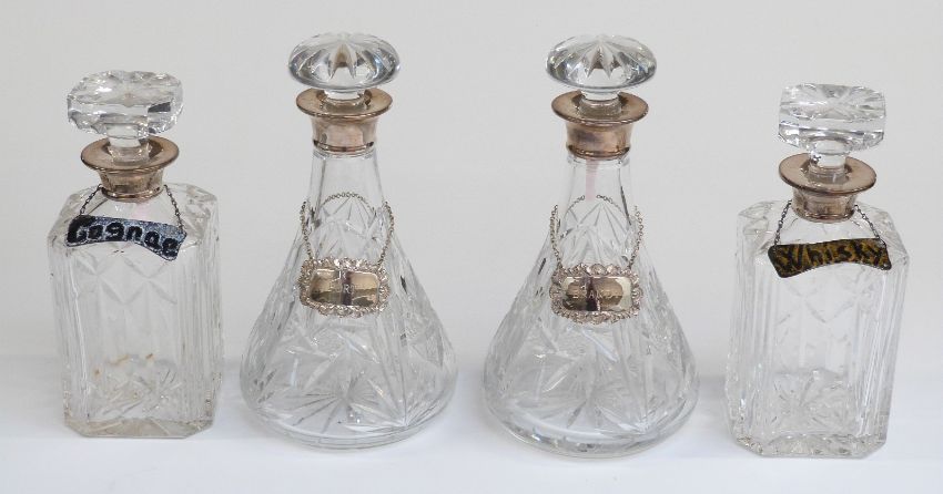 Two pairs of hallmarked silver mounted cut glass decanters with plated or enamel spirit tickets