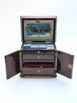 Rosewood sarcophagus-shaped jewellery or ladies' travelling chest with mother-of-pearl inlaid decoration and lock escutcheons and turned wooden handles. The lid lifts to reveal a silk-lined fitted interior and mirror, the doors open to reveal three graduated drawers with mother-of-pearl handles,,the bottom drawer containing an embossed velvet-lined writing slope, all raised on covered bun feet, 32x31x24cm