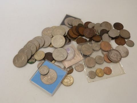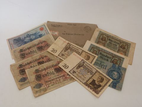 An amateur collection of bank notes and coins to include Georgian and Victorian crowns, Nazi, 1953 Coronation set, modern crowns, £5 and £2 coins, picture coins, WWII era Nazi bank notes etc