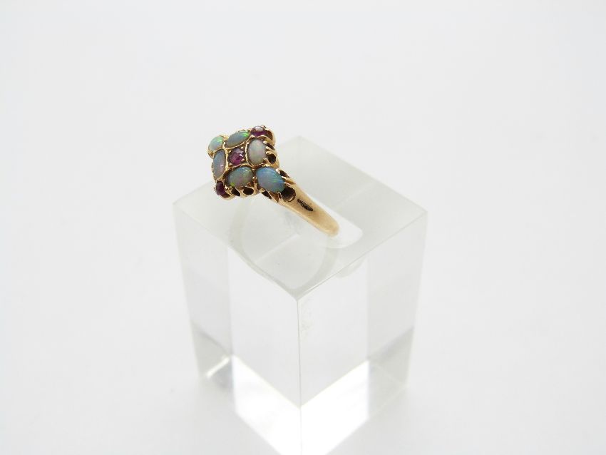 Victorian 18ct gold ring set with opal cabochons and three rubies, size M
