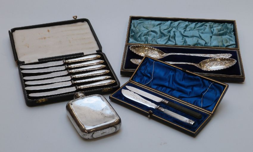Cased cutlery including hallmarked silver handled knives, plated berry spoons and a hip flask