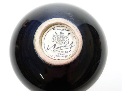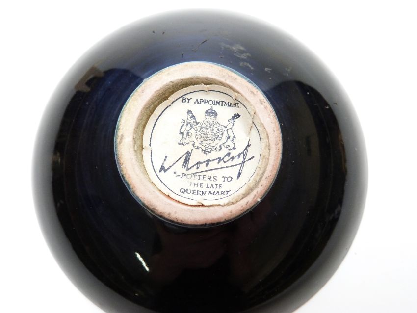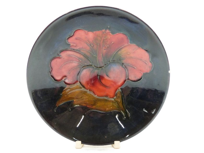 Moorcroft pedestal dish in Hibiscus pattern on a blue ground, diameter 9.5cm