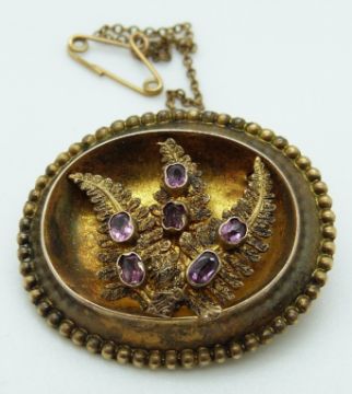 Victorian yellow metal mourning brooch with textured fern design set with six amethysts, verso a glass compartment, 7.92g, 3.3 x 2.8cm