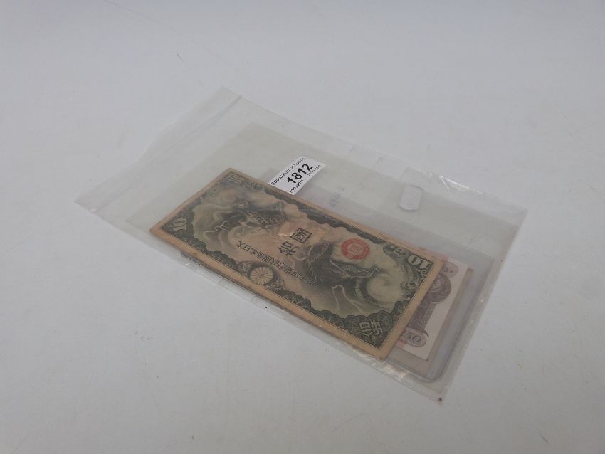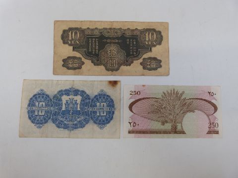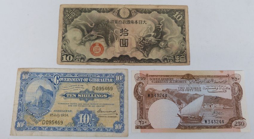 Japanese Imperial Government 1938 10 Yen military banknote issued for China, together with a 1954 Gibraltar ten shillings and a Southern Arabia 250 fils