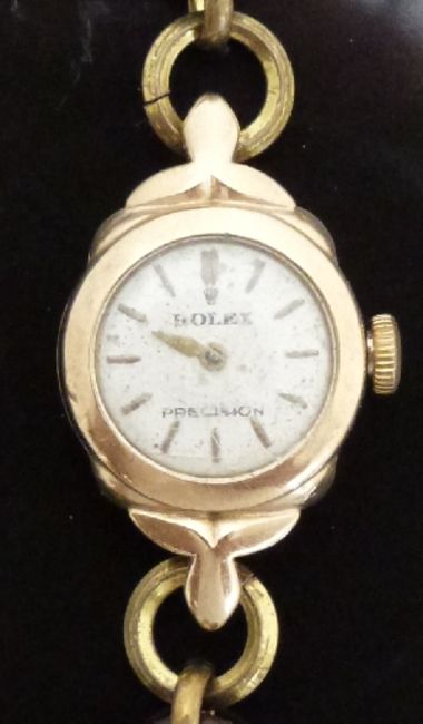 Rolex Precision 9ct gold ladies wristwatch with gold hands and baton markers, silver face and signed 17 jewel movement, on brown leather strap, case diameter 16.4mm, serial number 303473.