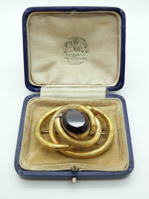 Victorian pinchbeck knot brooch set with a large stone, in J.J.Wood, Richmond box, 5.6 x 3.8cm