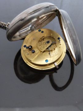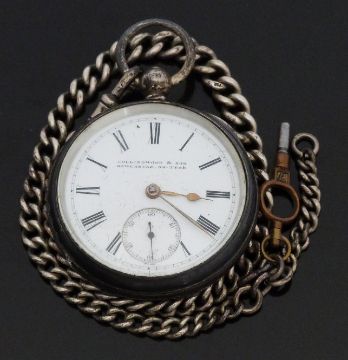 Collingwood & Son hallmarked silver open faced pocket watch with inset subsidiary seconds dial, Roman numerals, gold hands, engraved case and named and engraved movement, on hallmarked silver graduated chain, case diameter 72.2mm, serial number 469184.