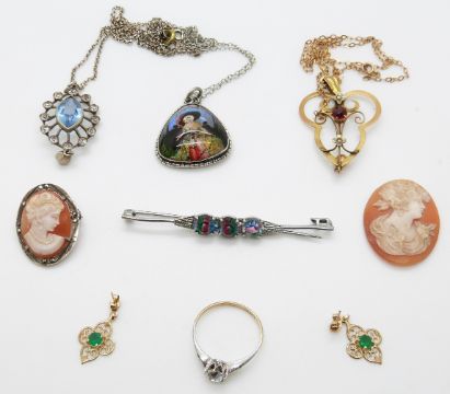 A 9ct gold Edwardian pendant and 9ct gold chain, 2.9g, a paste pendant, silver chain, silver pendant, 9ct gold and silver ring set with paste, a cameo brooch, 9ct gold earrings, 1.9g, etc