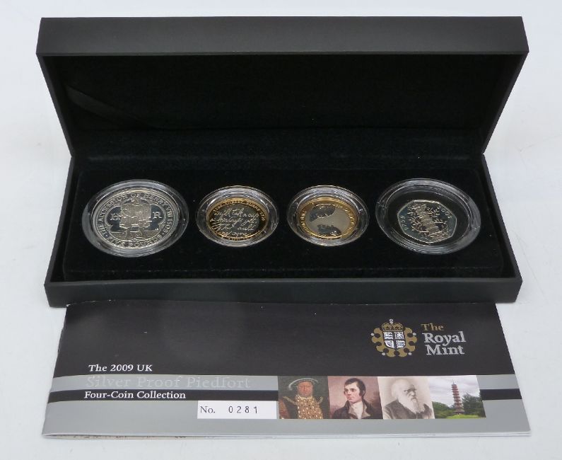 Royal Mint four coin silver proof piedfort collection 2009 includes Henry VII accession, Robert Burns, Charles Darwin and the Kew Gardens fifty pence, cased with certificate no. 0281