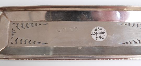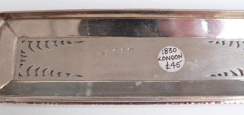 A hallmarked silver dressing table pot lid with pierced decoration, London 1830, maker Archibald Douglas, length 14cm, weight 83g